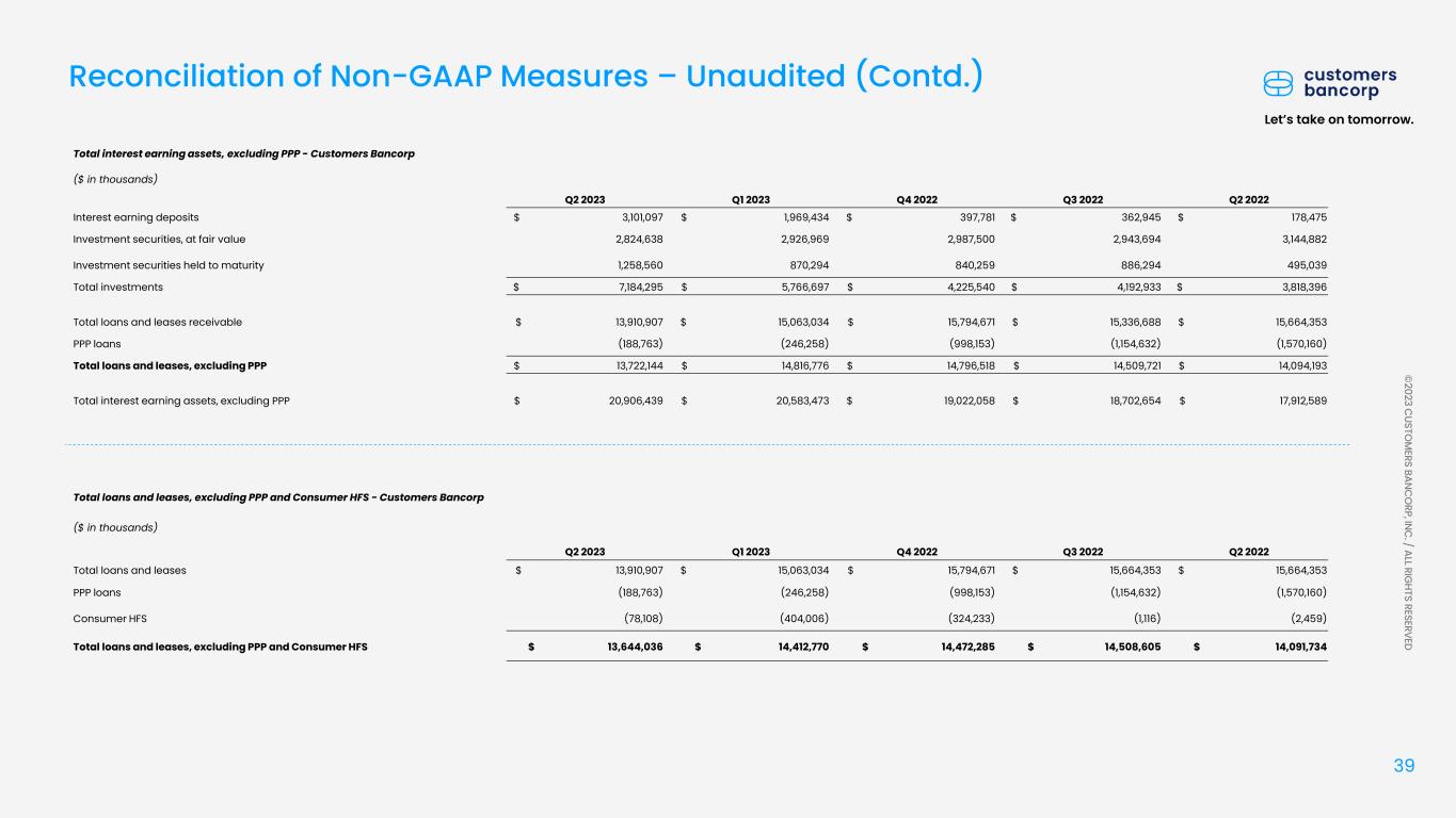 38 © 2023 C USTO M ERS BANC O RP, INC . / ALL RIG HTS RESERVED Let’s take on tomorrow. Reconciliation of Non-GAAP Measures – Unaudited (Contd.) Tangible Common Equity to Tangible Assets, excluding PPP - Customers Bancorp ($ in thousands except per share data) Q2 2023 Q1 2023 Q4 2022 Q3 2022 Q2 2022 GAAP total shareholders' equity $ 1,456,652 $ 1,421,020 $ 1,402,961 $ 1,386,931 $ 1,353,390 Reconciling items: Preferred stock (137,794) (137,794) (137,794) (137,794) (137,794) Goodwill and other intangibles (3,629) (3,629) (3,629) (3,629) (3,629) Tangible common equity $ 1,315,229 $ 1,279,597 $ 1,261,538 $ 1,245,508 $ 1,211,967 Total assets $ 22,028,565 $ 21,751,614 $ 20,896,112 $ 20,367,621 $ 20,251,996 Reconciling items: Goodwill and other intangibles (3,629) (3,629) (3,629) (3,629) (3,629) PPP loans (188,763) (246,258) (998,153) (1,154,632) (1,570,160) Tangible assets, excluding PPP $ 21,836,173 $ 21,501,727 $ 19,894,330 $ 19,209,360 $ 18,678,207 Tangible common equity to tangible assets, excluding PPP 6.0 % 6.0 % 6.3 % 6.5 % 6.5 %