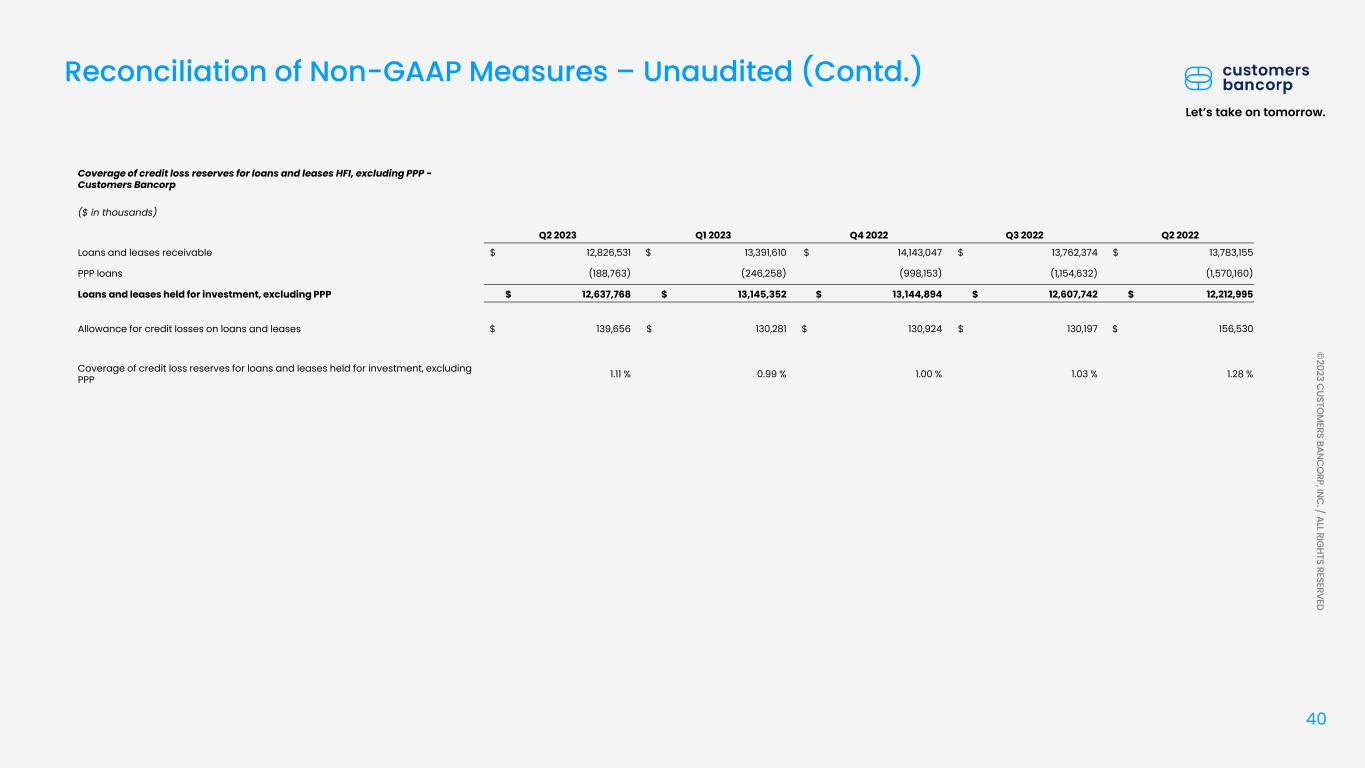 39 © 2023 C USTO M ERS BANC O RP, INC . / ALL RIG HTS RESERVED Let’s take on tomorrow. Reconciliation of Non-GAAP Measures – Unaudited (Contd.) Total loans and leases, excluding PPP and Consumer HFS - Customers Bancorp ($ in thousands) Q2 2023 Q1 2023 Q4 2022 Q3 2022 Q2 2022 Total loans and leases $ 13,910,907 $ 15,063,034 $ 15,794,671 $ 15,664,353 $ 15,664,353 PPP loans (188,763) (246,258) (998,153) (1,154,632) (1,570,160) Consumer HFS (78,108) (404,006) (324,233) (1,116) (2,459) Total loans and leases, excluding PPP and Consumer HFS $ 13,644,036 $ 14,412,770 $ 14,472,285 $ 14,508,605 $ 14,091,734 Total interest earning assets, excluding PPP - Customers Bancorp ($ in thousands) Q2 2023 Q1 2023 Q4 2022 Q3 2022 Q2 2022 Interest earning deposits $ 3,101,097 $ 1,969,434 $ 397,781 $ 362,945 $ 178,475 Investment securities, at fair value 2,824,638 2,926,969 2,987,500 2,943,694 3,144,882 Investment securities held to maturity 1,258,560 870,294 840,259 886,294 495,039 Total investments $ 7,184,295 $ 5,766,697 $ 4,225,540 $ 4,192,933 $ 3,818,396 Total loans and leases receivable $ 13,910,907 $ 15,063,034 $ 15,794,671 $ 15,336,688 $ 15,664,353 PPP loans (188,763) (246,258) (998,153) (1,154,632) (1,570,160) Total loans and leases, excluding PPP $ 13,722,144 $ 14,816,776 $ 14,796,518 $ 14,509,721 $ 14,094,193 Total interest earning assets, excluding PPP $ 20,906,439 $ 20,583,473 $ 19,022,058 $ 18,702,654 $ 17,912,589