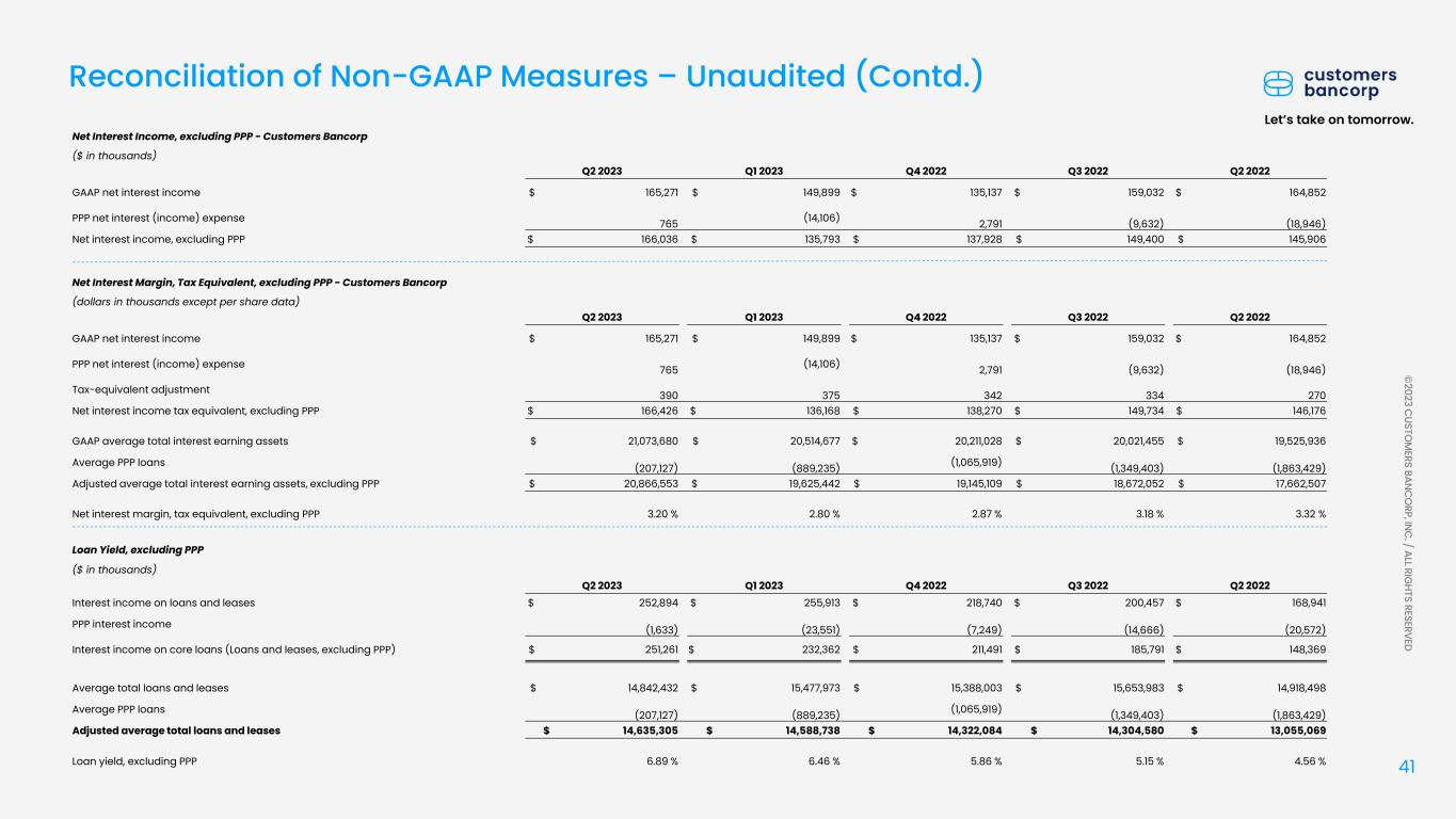 40 © 2023 C USTO M ERS BANC O RP, INC . / ALL RIG HTS RESERVED Let’s take on tomorrow. Reconciliation of Non-GAAP Measures – Unaudited (Contd.) Coverage of credit loss reserves for loans and leases HFI, excluding PPP - Customers Bancorp ($ in thousands) Q2 2023 Q1 2023 Q4 2022 Q3 2022 Q2 2022 Loans and leases receivable $ 12,826,531 $ 13,391,610 $ 14,143,047 $ 13,762,374 $ 13,783,155 PPP loans (188,763) (246,258) (998,153) (1,154,632) (1,570,160) Loans and leases held for investment, excluding PPP $ 12,637,768 $ 13,145,352 $ 13,144,894 $ 12,607,742 $ 12,212,995 Allowance for credit losses on loans and leases $ 139,656 $ 130,281 $ 130,924 $ 130,197 $ 156,530 Coverage of credit loss reserves for loans and leases held for investment, excluding PPP 1.11 % 0.99 % 1.00 % 1.03 % 1.28 %